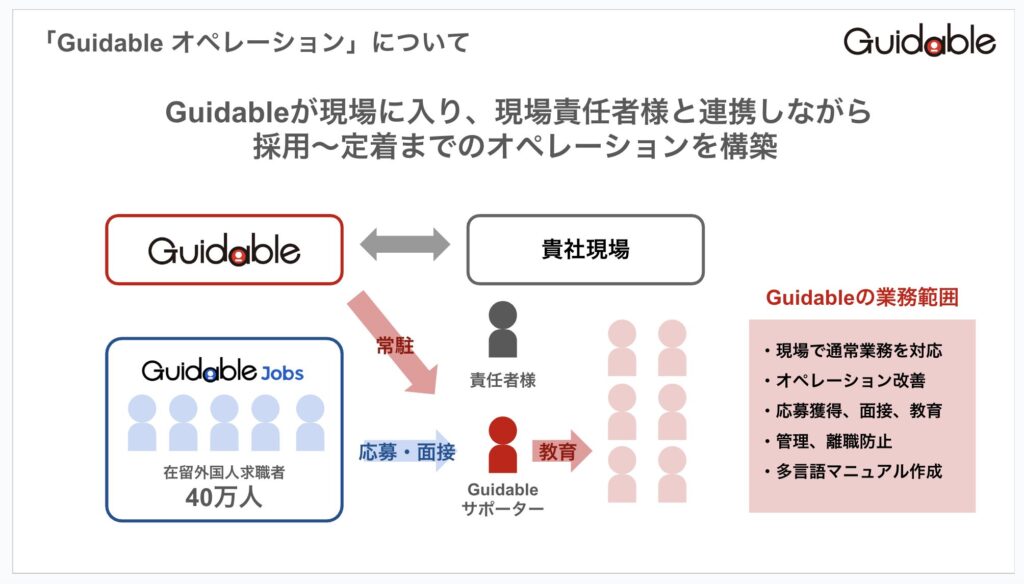 こうした状況を受け、これまでに1万人以上の在留外国人の採用を支援してきたGuidableは、外国人の採用から定着・活躍までを一貫して支援する新たな現場の運営スキームの提供に至りました。